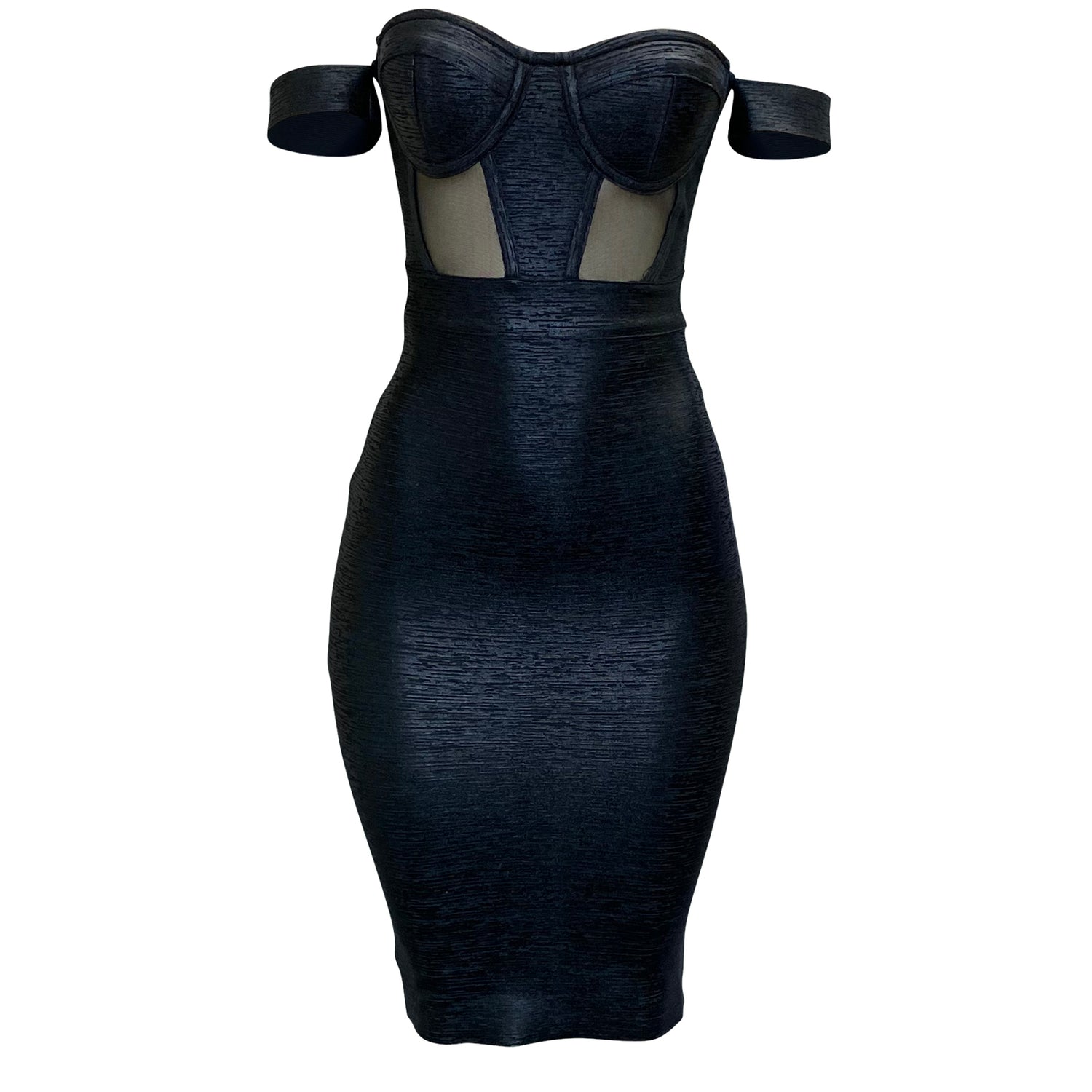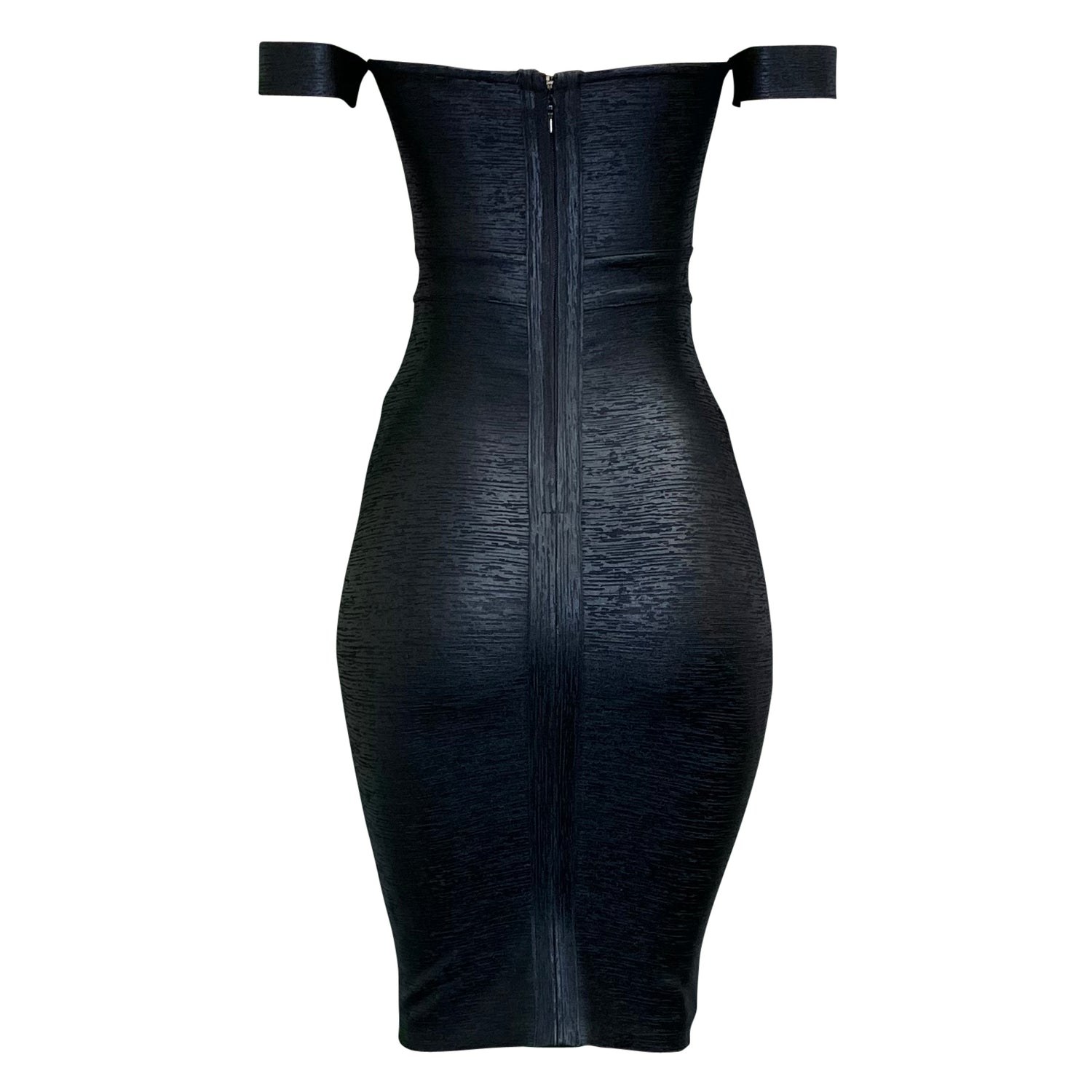 This Is A Black Metallic Off Shoulder Bandage Dress.